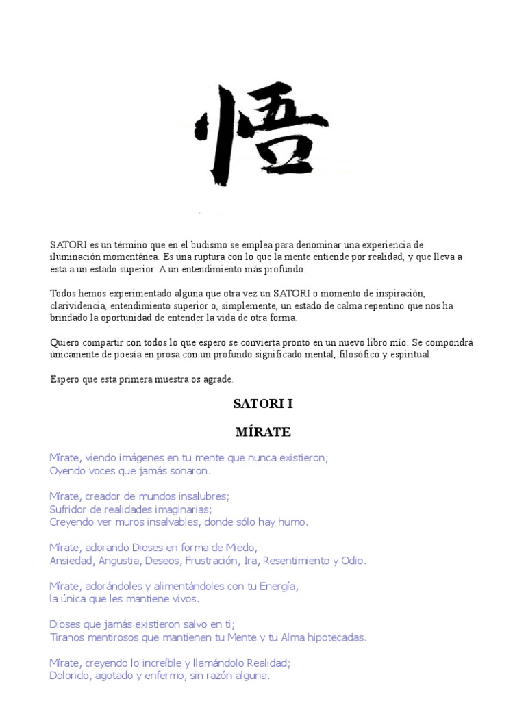 Es una ruptura con lo que la mente entiende por realidad, y que lleva a sta a un estado superior. A un entendimiento ms profundo. Todos hemos experimentado alguna que otra vez un SATORI o momento de inspiracin, clarividencia, entendimiento superior o, simplemente, un estado de calma repentino que nos ha brindado la oportunidad de entender la vida de otra forma. Quiero compartir con todos lo que espero se convierta pronto en un nuevo libro mo. Se compondr nicamente de poesa en prosa con un profundo significado mental, filosfico y espiritual. Espero que esta primera muestra os agrade.