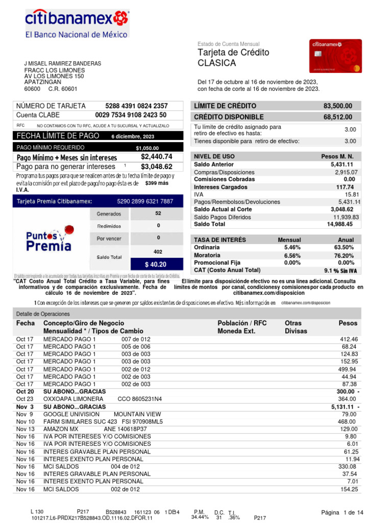 Pago para no generar intereses $3,048.62 Saldo Anterior 5,431.11