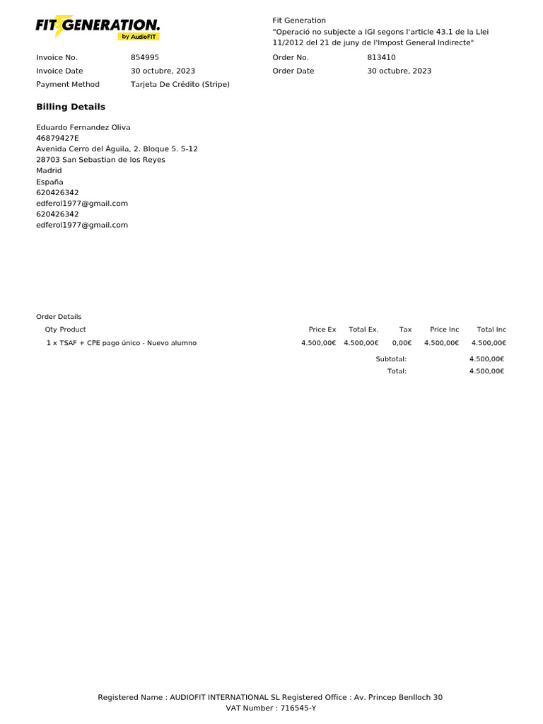 Registered Name : AUDIOFIT INTERNATIONAL SL Registered Office : Av. Princep Benlloch 30