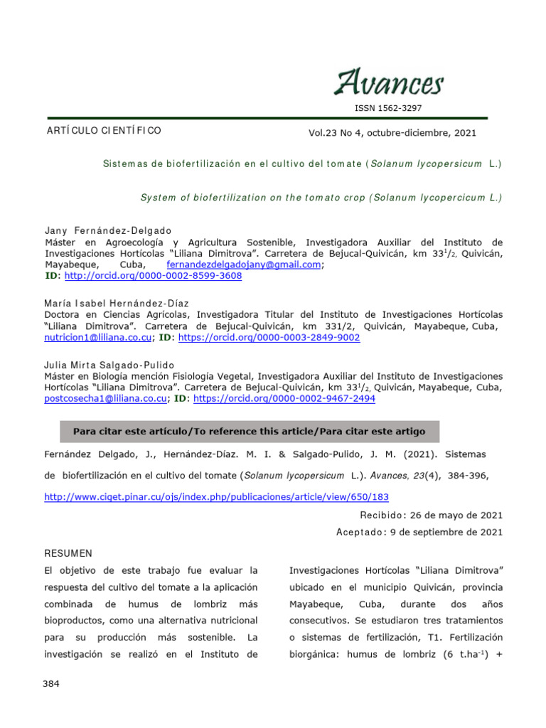 de biofertilización en el cultivo del tomate (Solanum lycopersicum L.). Avances, 23(4), 384-396,