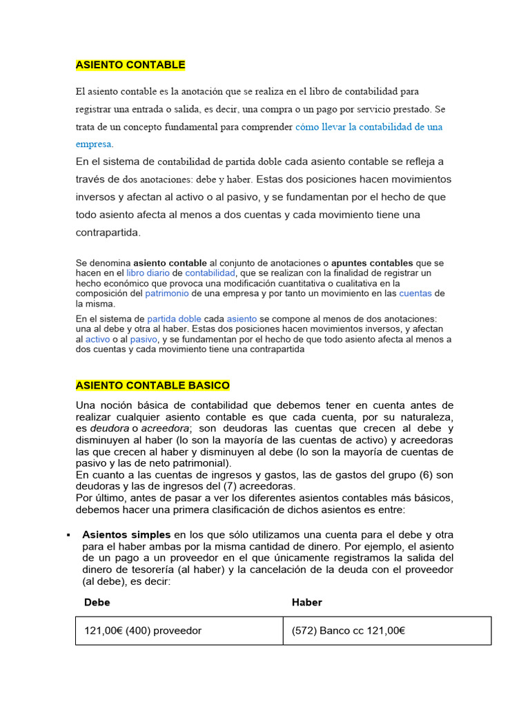 Se denomina asiento contable al conjunto de anotaciones o apuntes contables que se