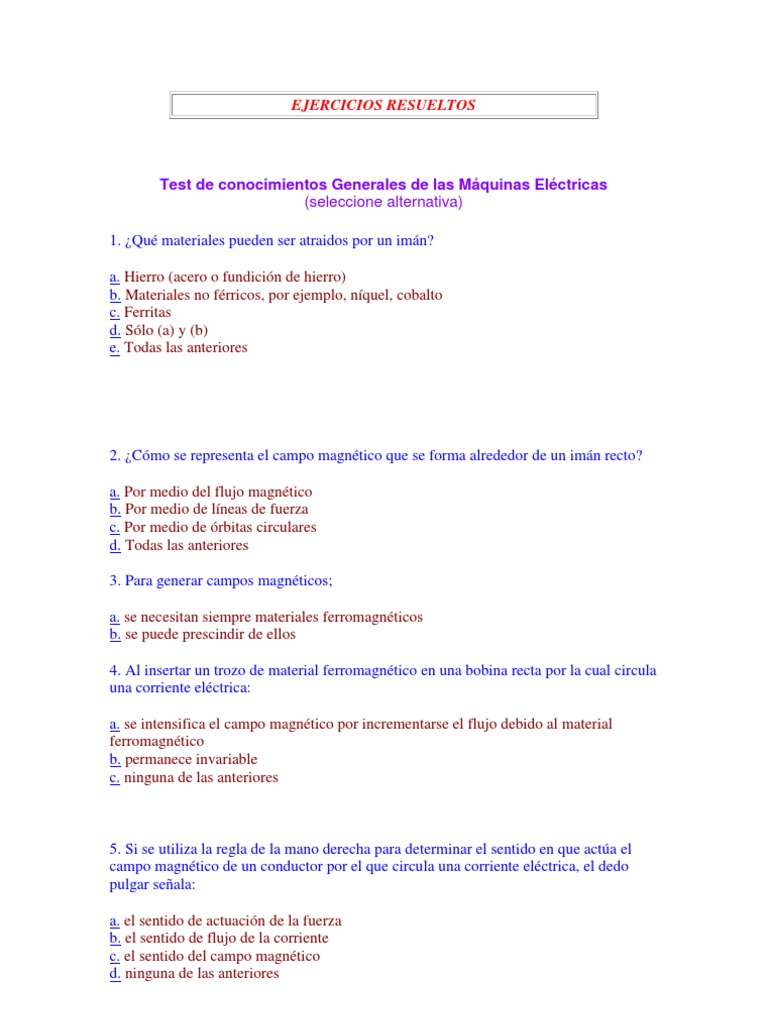 Test de conocimientos Generales de las Mquinas Elctricas (seleccione alternativa) 1. Qu materiales pueden ser atraidos por un imn? a. Hierro (acero o fundicin de hierro) b. Materiales no frricos, por ejemplo, nquel, cobalto c. Ferritas d. Slo (a) y (b) e. Todas las anteriores