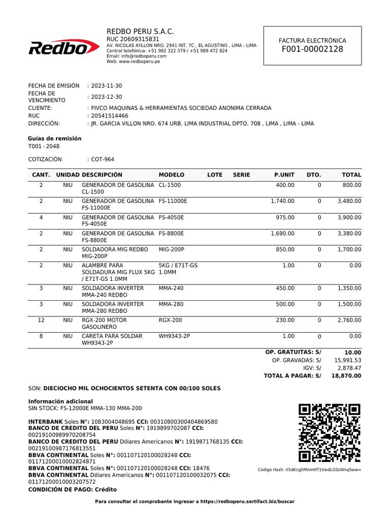 • Factura a 30 días / Fecha: 30-12-2023 / Monto: S/18870