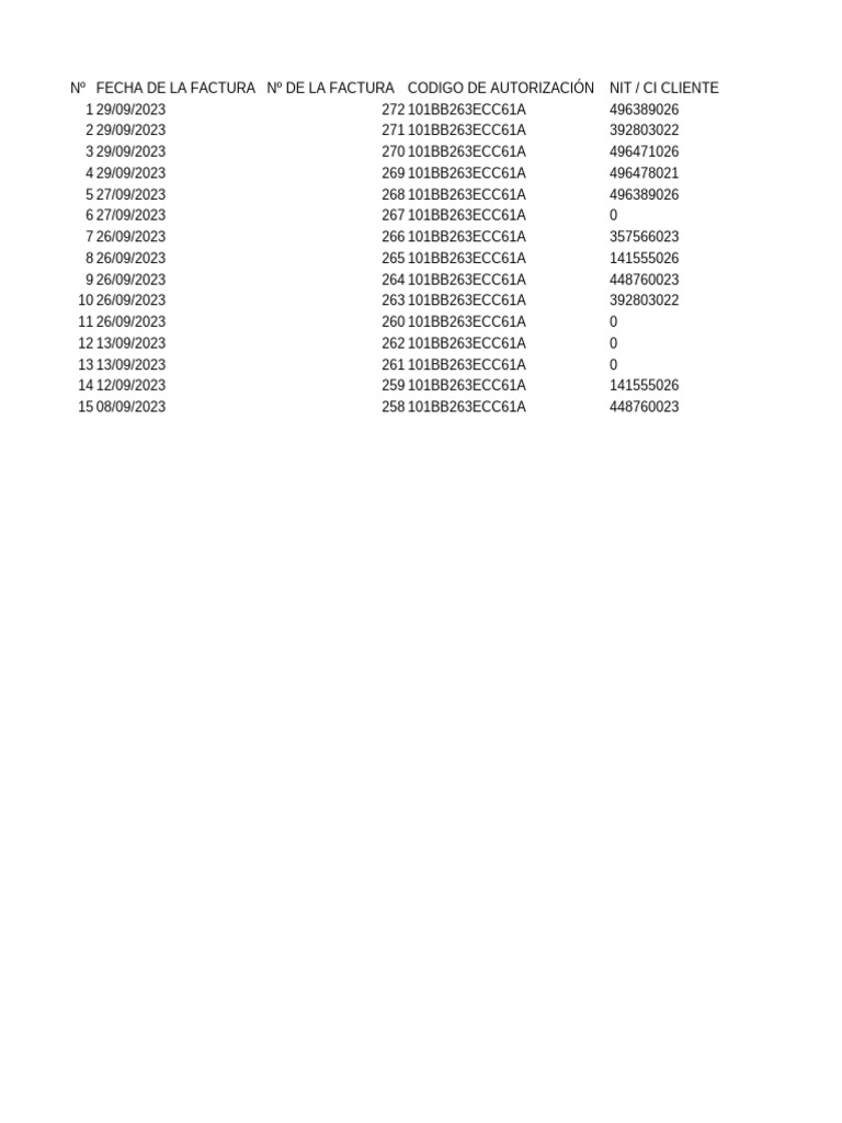 Nº FECHA DE LA FACTURA Nº DE LA FACTURA CODIGO DE AUTORIZACIÓN NIT / CI CLIENTE
