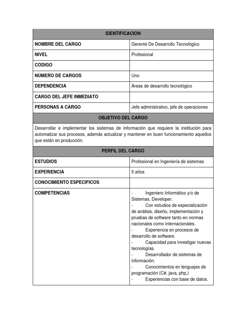 NOMBRE DEL CARGO Gerente De Desarrollo Tecnológico
