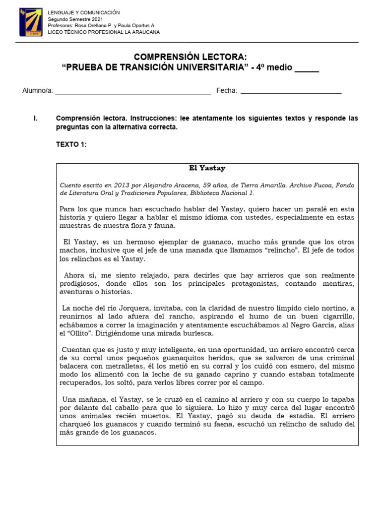 I. Comprensión lectora. Instrucciones: lee atentamente los siguientes textos y responde las
