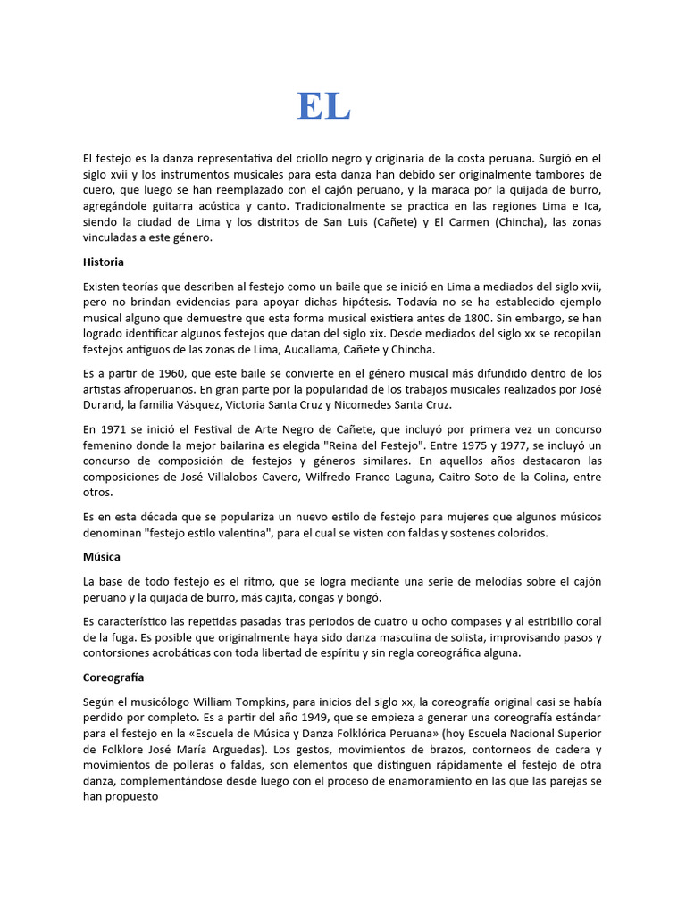 El festejo es la danza representativa del criollo negro y originaria de la costa peruana. Surgió en el