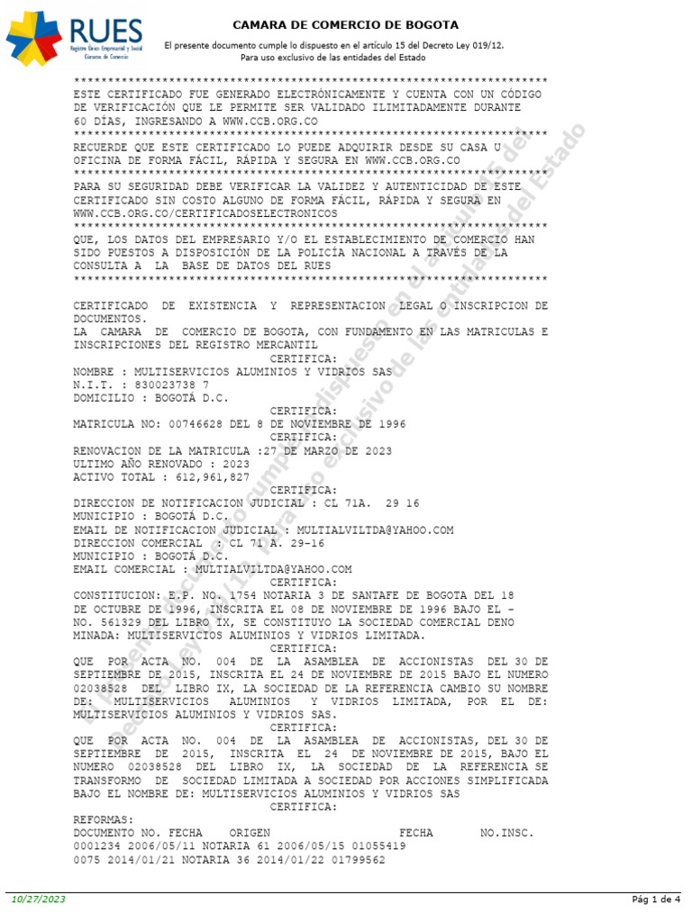 NOMBRE : MULTISERVICIOS ALUMINIOS Y VIDRIOS SAS