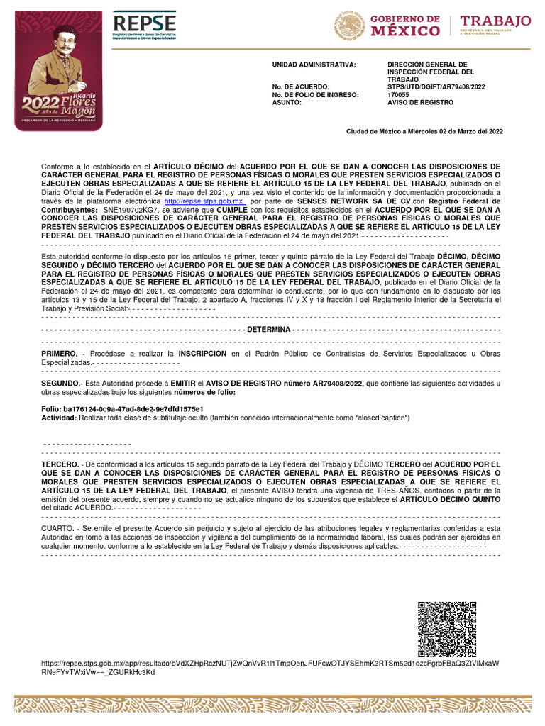 No. DE ACUERDO: STPS/UTD/DGIFT/AR79408/2022