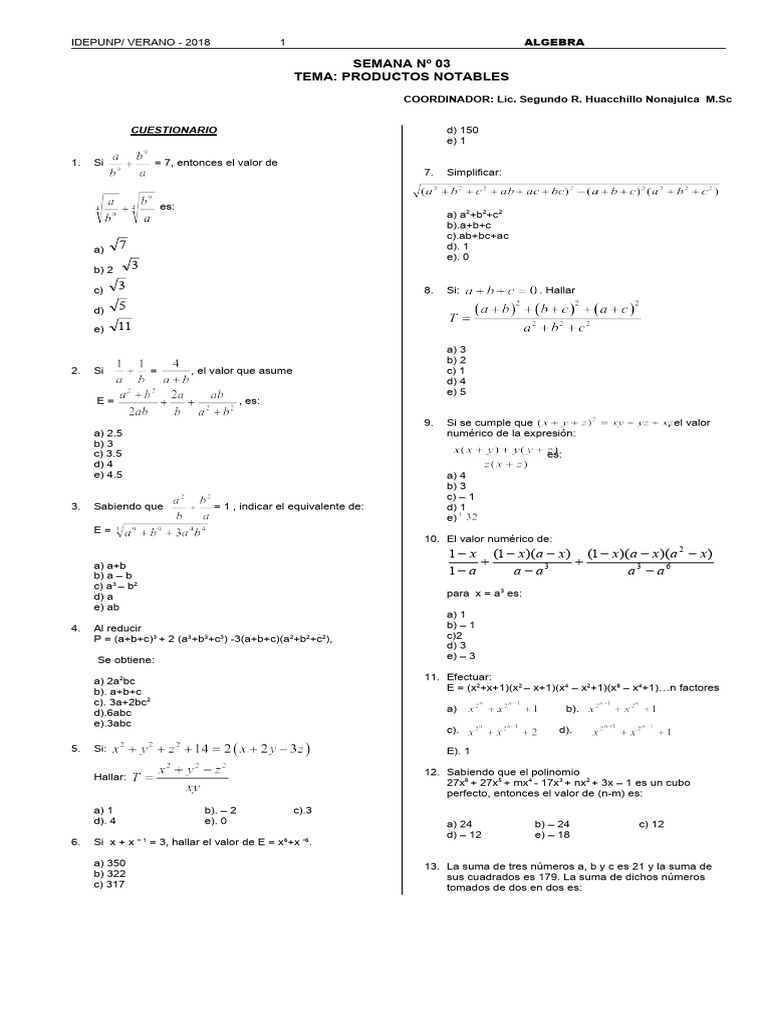 IDEPUNP/ VERANO - 2018 3 ALGEBRA