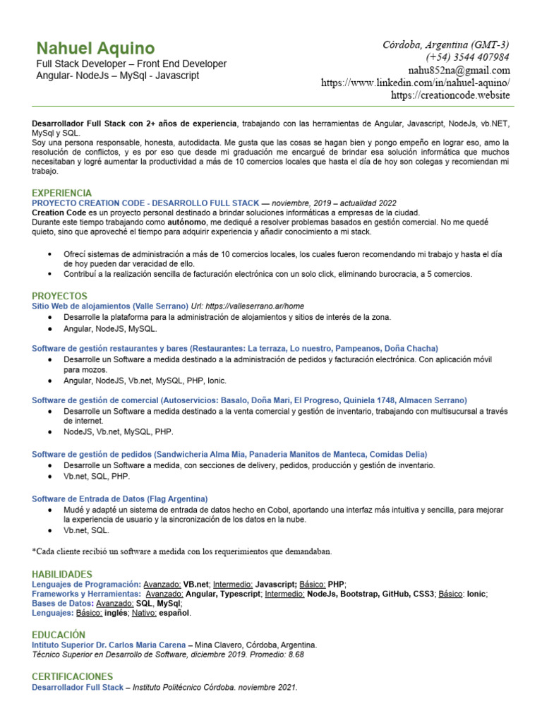 Desarrollador Full Stack con 2+ años de experiencia, trabajando con las herramientas de Angular, Javascript, NodeJs, vb.NET,