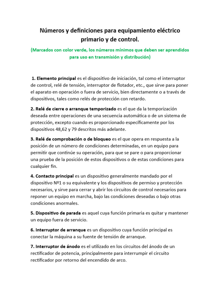 Números y definiciones para equipamiento eléctrico
