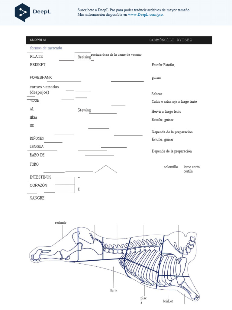 4. terrón de paletilla recortado, 5. estofado, 6. mollejas,7. hígado, 8. riñón