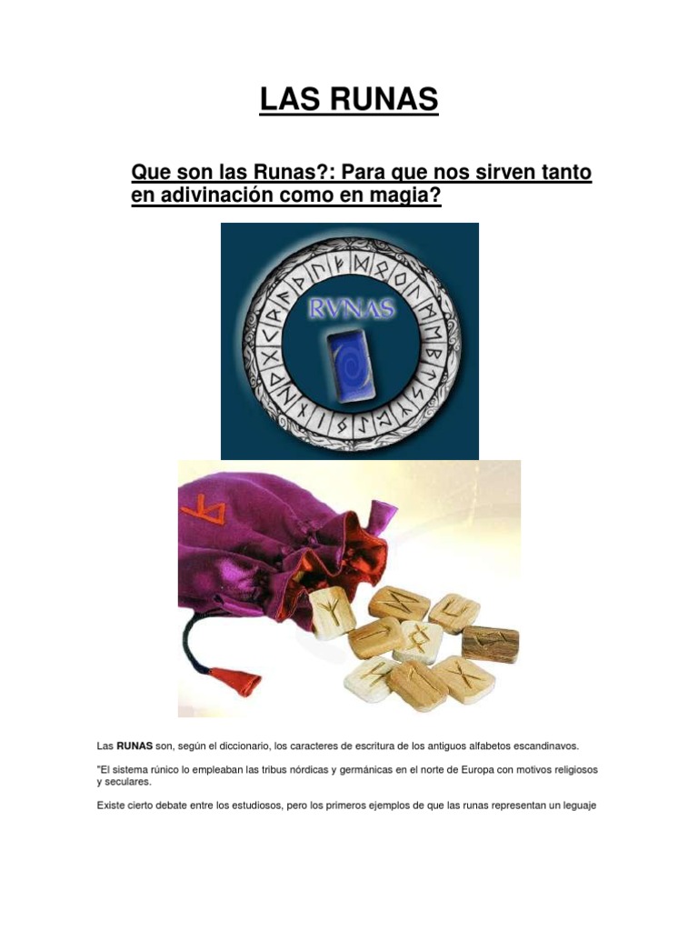 Las RUNAS son, segn el diccionario, los caracteres de escritura de los antiguos alfabetos escandinavos. "El sistema rnico lo empleaban las tribus nrdicas y germnicas en el norte de Europa con motivos religiosos y seculares. Existe cierto debate entre los estudiosos, pero los primeros ejemplos de que las runas representan un leguaje