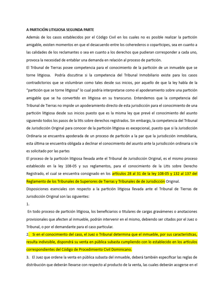 Disposiciones esenciales con respecto a la partición litigiosa llevada ante el Tribunal de Tierras de