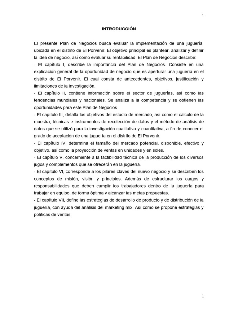 El presente Plan de Negocios busca evaluar la implementación de una juguería,