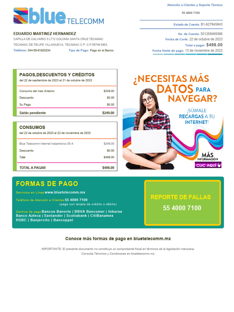 Teléfono: 0445561820234 Tipo de Pago: Pago en el Banco Fecha límite de pago: 13 de noviembre de 2023