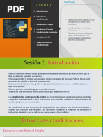 Este documento presenta los primeros conceptos básicos de programación en Python. Introduce Python como un lenguaje de programación de código abierto y multiplataforma que se usa ampliamente. Explica cómo modelar conceptos del mundo real como un juego de cartas usando variables y listas en Python. También define qué es un programa y explica el uso de funciones para agrupar instrucciones reutilizables. El objetivo es familiarizar a los estudiantes con los elementos fundamentales de Python antes de profundizar en temas más avanzados.