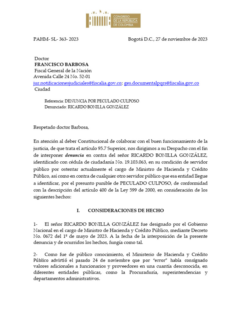 de interponer denuncia en contra del señor RICARDO BONILLA GONZÁLEZ,