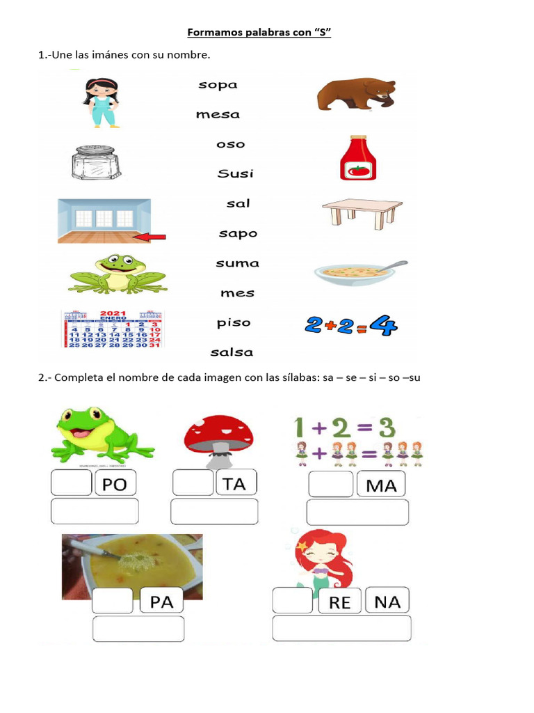 El documento presenta una actividad para formar palabras con la letra "S" uniendo sílabas y imágenes. Los estudiantes unen imágenes con nombres que completan con sílabas como "sa", "se", "si", "so" o "su", y luego escriben oraciones con los nombres resultantes.