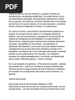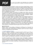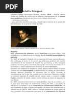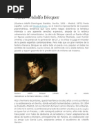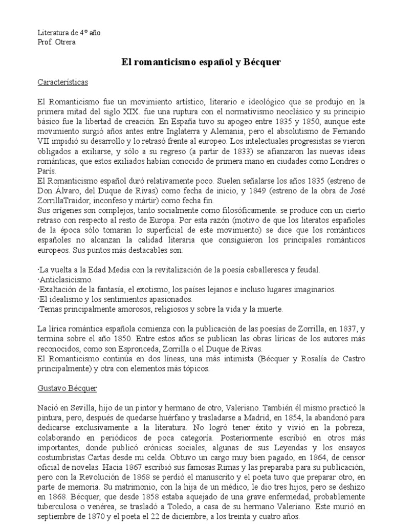 Caractersticas El Romanticismo fue un movimiento artstico, literario e ideolgico que se produjo en la primera mitad del siglo XIX. fue una ruptura con el normativismo neoclsico y su principio bsico fue la libertad de creacin. En Espaa tuvo su apogeo entre 1835 y 1850, aunque este movimiento surgi aos antes entre Inglaterra y Alemania, pero el absolutismo de Fernando VII impidi su desarrollo y lo retras frente al europeo. Los intelectuales progresistas se vieron obligados a exiliarse, y slo a su regreso (a partir de 1833) se afianzaron las nuevas ideas romnticas, que estos exiliados haban conocido de primera mano en ciudades como Londres o Pars. El Romanticismo espaol dur relativamente poco. Suelen sealarse los aos 1835 (estreno de Don lvaro, del Duque de Rivas) como fecha de inicio, y 1849 (estreno de la obra de Jos ZorrillaTraidor, inconfeso y mrtir) como fecha fin. Sus orgenes son complejos, tanto socialmente como filosficamente. se produce con un cierto retraso con respecto al resto de Europa. Por esta razn (motivo de que los literatos espaoles de la poca slo tomaran lo superficial de este movimiento) se dice que los romnticos espaoles no alcanzan la calidad literaria que consiguieron los principales romnticos europeos. Sus puntos ms destacables son: La vuelta a la Edad Media con la revitalizacin de la poesa caballeresca y feudal. Anticlasicismo. Exaltacin de la fantasa, el exotismo, los pases lejanos e incluso lugares imaginarios. El idealismo y los sentimientos apasionados. Temas principalmente amorosos, religiosos y sobre la vida y la muerte. La lrica romntica espaola comienza con la publicacin de las poesas de Zorrilla, en 1837, y termina sobre el ao 1850. Entre estos aos se publican las obras lricas de los autores ms reconocidos, como son Espronceda, Zorrilla o el Duque de Rivas. El Romanticismo contina en dos lneas, una ms intimista (Bcquer y Rosala de Castro principalmente) y otra con elementos ms tpicos. Gustavo Bcquer Naci en Sevilla, hijo de un pintor y hermano de otro, Valeriano. Tambin l mismo practic la pintura, pero, despus de quedarse hurfano y trasladarse a Madrid, en 1854, la abandon para dedicarse exclusivamente a la literatura. No logr tener xito y vivi en la pobreza, colaborando en peridicos de poca categora. Posteriormente escribi en otros ms importantes, donde public crnicas sociales, algunas de sus Leyendas y los ensayos costumbristas Cartas desde mi celda. Obtuvo un cargo muy bien pagado, en 1864, de censor oficial de novelas. Hacia 1867 escribi sus famosas Rimas y las preparaba para su publicacin, pero con la Revolucin de 1868 se perdi el manuscrito y el poeta tuvo que preparar otro, en parte de memoria. Su matrimonio, con la hija de un mdico, le dio tres hijos, pero se deshizo en 1868. Bcquer, que desde 1858 estaba aquejado de una grave enfermedad, probablemente tuberculosa o venrea, se traslad a Toledo, a casa de su hermano Valeriano. Este muri en septiembre de 1870 y el poeta el 22 de diciembre, a los treinta y cuatro aos.