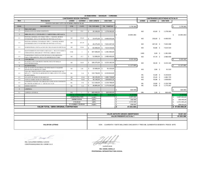 CANTIDADES SEGÚN CONTRATO CANTIDADES EJECUTADAS ACTA No 01