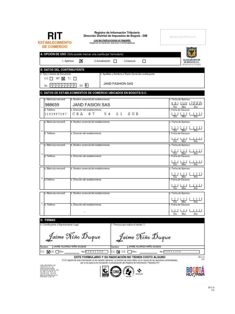 registró en la Cámara de Comercio de Bogotá. En caso Registro de Información Tributaria RIT, queda automáticamente surtida