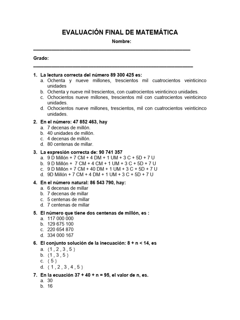 EVALUACIÓN FINAL DE MATEMÁTICA