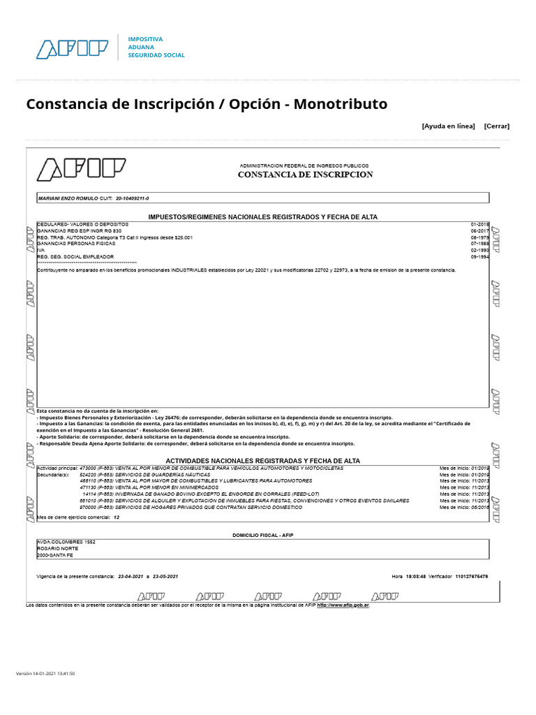 Vigencia de la presente constancia: 23-04-2021 a 23-05-2021 Hora 18:03:48 Verificador 110127675479