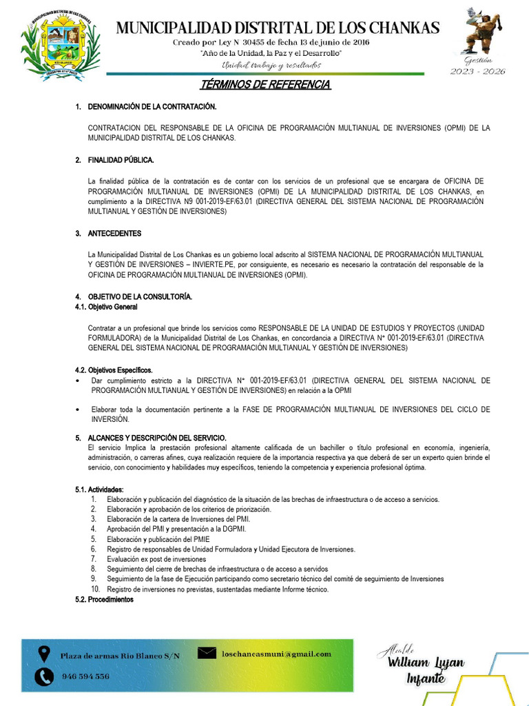 CONTRATACION DEL RESPONSABLE DE LA OFICINA DE PROGRAMACIÓN MULTIANUAL DE INVERSIONES (OPMI) DE LA