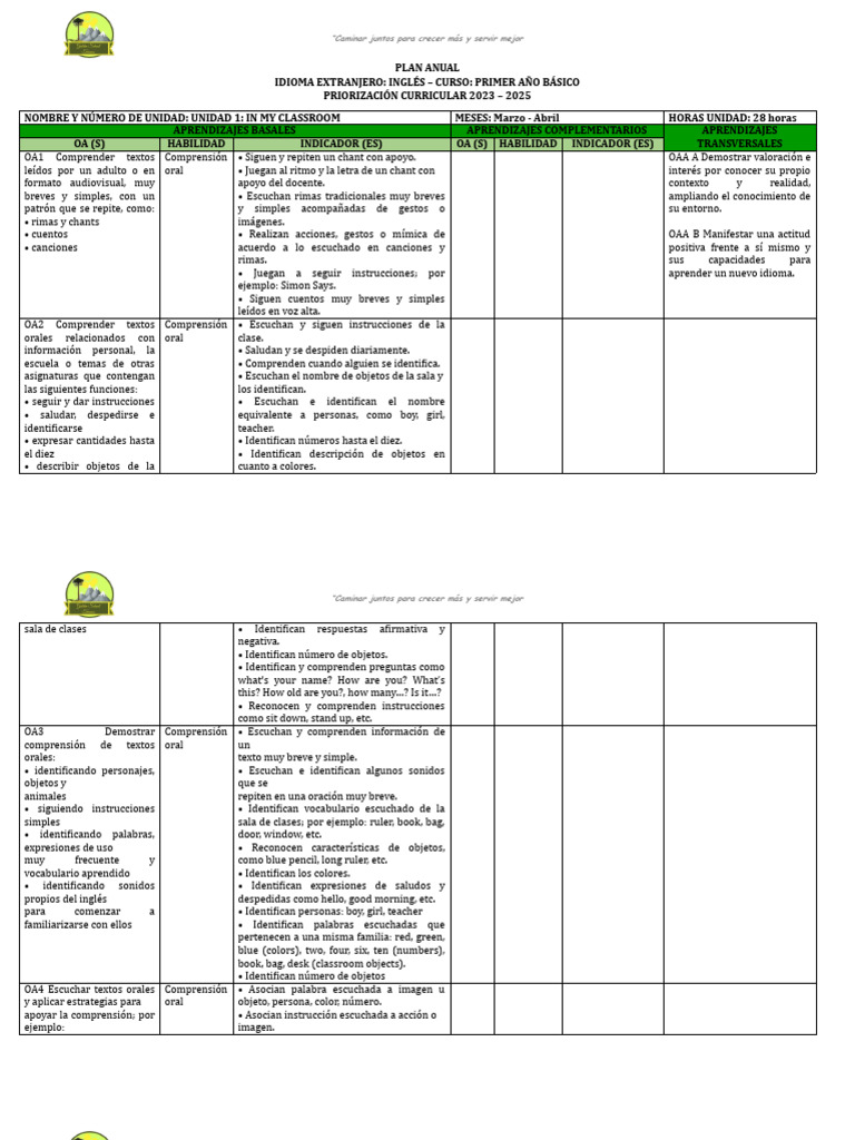 NOMBRE Y NÚMERO DE UNIDAD: UNIDAD 1: IN MY CLASSROOM MESES: Marzo - Abril HORAS UNIDAD: 28 horas