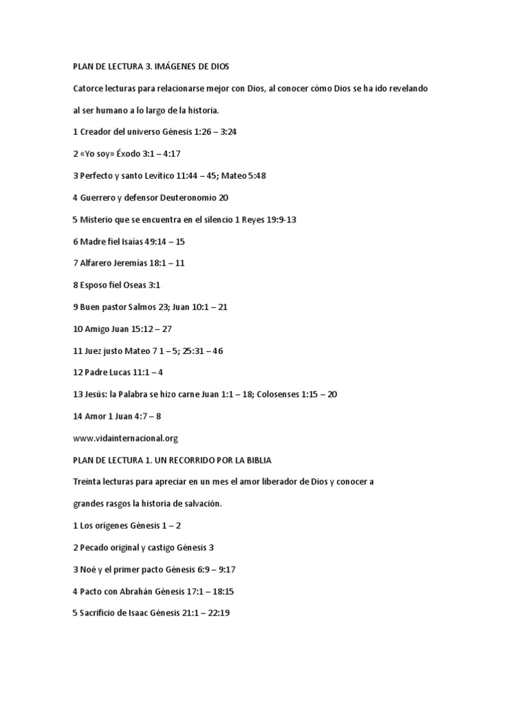 IMGENES DE DIOS Catorce lecturas para relacionarse mejor con Dios, al conocer cmo Dios se ha ido revelando al ser humano a lo largo de la historia. 1 Creador del universo Gnesis 1:26 3:24 2 Yo soy xodo 3:1 4:17 3 Perfecto y santo Levtico 11:44 45; Mateo 5:48 4 Guerrero y defensor Deuteronomio 20 5 Misterio que se encuentra en el silencio 1 Reyes 19:9-13 6 Madre fiel Isaas 49:14 15 7 Alfarero Jeremas 18:1 11 8 Esposo fiel Oseas 3:1 9 Buen pastor Salmos 23; Juan 10:1 21 10 Amigo Juan 15:12 27 11 Juez justo Mateo 7 1 5; 25:31 46 12 Padre Lucas 11:1 4 13 Jess: la Palabra se hizo carne Juan 1:1 18; Colosenses 1:15 20 14 Amor 1 Juan 4:7 8 www.vidainternacional.org PLAN DE LECTURA 1. UN RECORRIDO POR LA BIBLIA Treinta lecturas para apreciar en un mes el amor liberador de Dios y conocer a grandes rasgos la historia de salvacin. 1 Los orgenes Gnesis 1 2 2 Pecado original y castigo Gnesis 3 3 No y el primer pacto Gnesis 6:9 9:17 4 Pacto con Abrahn Gnesis 17:1 18:15 5 Sacrificio de Isaac Gnesis 21:1 22:19