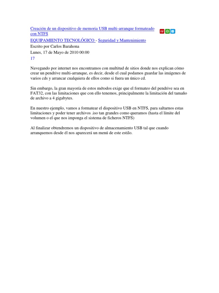 Barahona Lunes, 17 de Mayo de 2010 00:00 17 Navegando por internet nos encontramos con multitud de sitios donde nos explican cmo crear un pendrive multi-arranque, es decir, desde el cual podamos guardar las imgenes de varios cds y arrancar cualquiera de ellos como si fuera un nico cd. Sin embargo, la gran mayora de estos mtodos exige que el formateo del pendrive sea en FAT32, con las limitaciones que con ello tenemos, principalmente la limitacin del tamao de archivo a 4 gigabytes. En nuestro ejemplo, vamos a formatear el dispositivo USB en NTFS, para saltarnos estas limitaciones y poder tener archivos .iso tan grandes como queramos (hasta el lmite del volumen o el que nos imponga el sistema de ficheros NTFS) Al finalizar obtendremos un dispositivo de almacenamiento USB tal que cuando arranquemos desde l nos aparecer un men de este estilo.