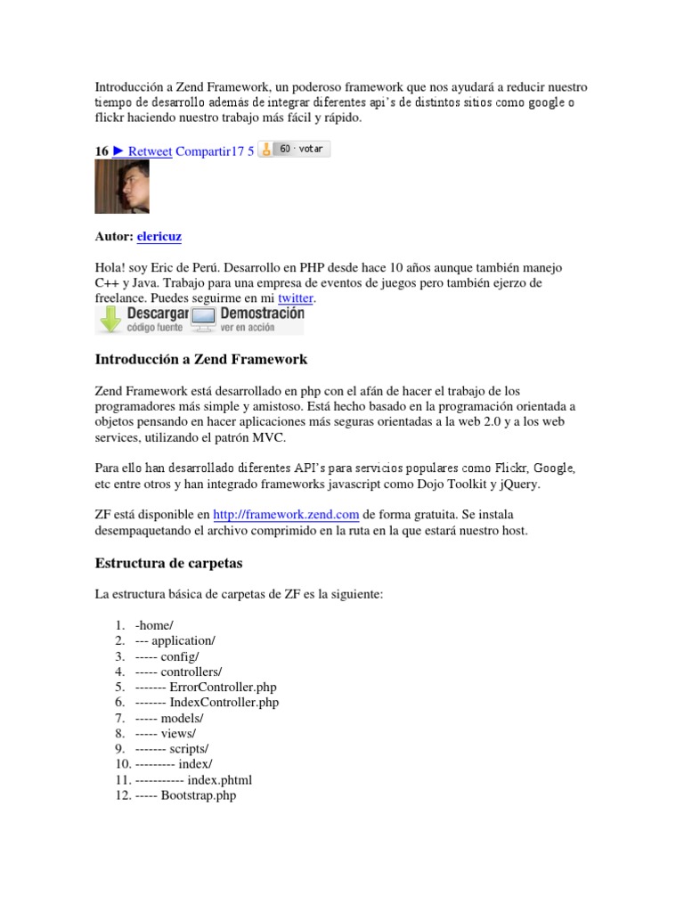 La estructura bsica de carpetas de ZF es la siguiente: 1. -home/ 2. --- application/ 3. ----- config/ 4. ----- controllers/ 5. ------- ErrorController.php 6. ------- IndexController.php 7. ----- models/ 8. ----- views/ 9. ------- scripts/ 10. --------- index/ 11. ----------- index.phtml 12. ----- Bootstrap.php