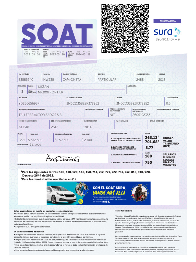 • Recuerde portar siempre su SOAT, las autoridades de tránsito se lo pueden solicitar en cualquier momento.