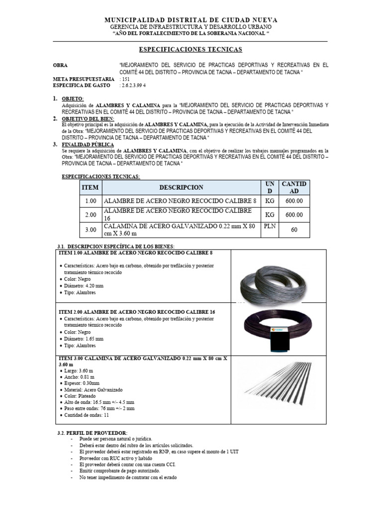 Adquisición de ALAMBRES Y CALAMINA para la “MEJORAMIENTO DEL SERVICIO DE PRACTICAS DEPORTIVAS Y