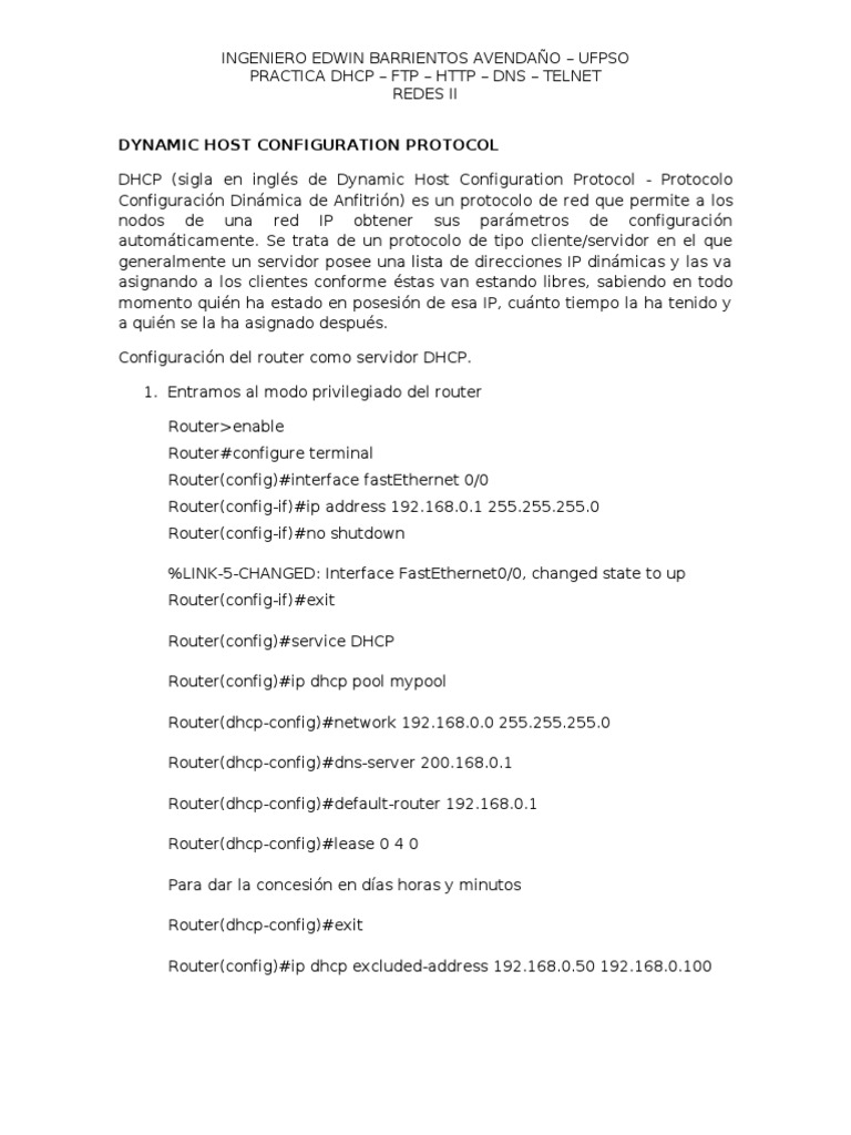 INGENIERO EDWIN BARRIENTOS AVENDAO UFPSO PRACTICA DHCP FTP HTTP DNS TELNET REDES II DYNAMIC HOST CONFIGURATION