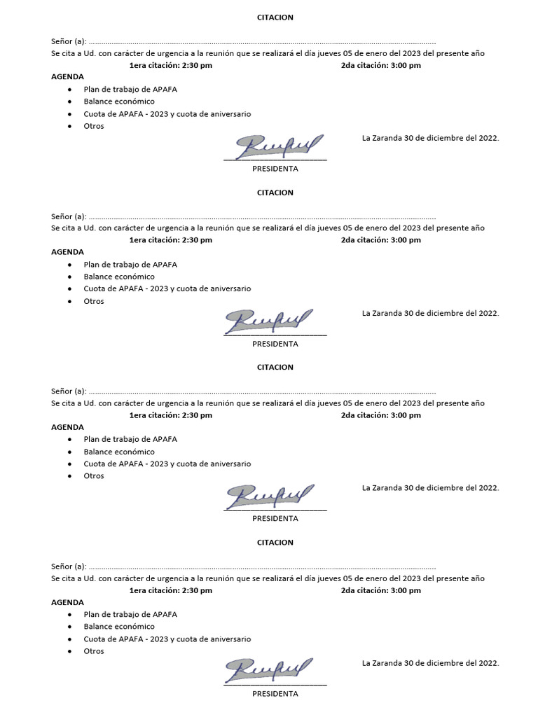 Se cita a Ud. con carácter de urgencia a la reunión que se realizará el día jueves 05 de enero del 2023 del presente año