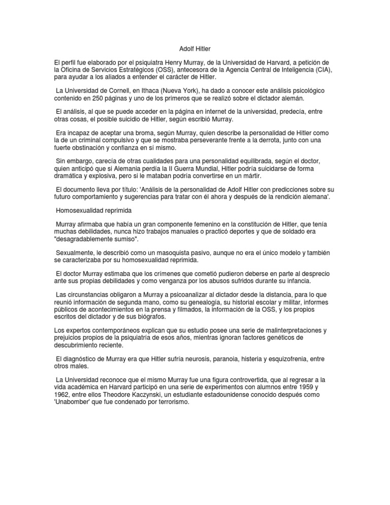 (OSS), antecesora de la Agencia Central de Inteligencia (CIA), para ayudar a los aliados a entender el carcter de Hitler. La Universidad de Cornell, en Ithaca (Nueva York), ha dado a conocer este anlisis psicolgico contenido en 250 pginas y uno de los primeros que se realiz sobre el dictador alemn. El anlisis, al que se puede acceder en la pgina en internet de la universidad, predeca, entre otras cosas, el posible suicidio de Hitler, segn escribi Murray. Era incapaz de aceptar una broma, segn Murray, quien describe la personalidad de Hitler como la de un criminal compulsivo y que se mostraba perseverante frente a la derrota, junto con una fuerte obstinacin y confianza en s mismo. Sin embargo, careca de otras cualidades para una personalidad equilibrada, segn el doctor, quien anticip que si Alemania perda la II Guerra Mundial, Hitler podra suicidarse de forma dramtica y explosiva, pero si le mataban podra convertirse en un mrtir. El documento lleva por ttulo: 'Anlisis de la personalidad de Adolf Hitler con predicciones sobre su futuro comportamiento y sugerencias para tratar con l ahora y despus de la rendicin alemana'. Homosexualidad reprimida Murray afirmaba que haba un gran componente femenino en la constitucin de Hitler, que tena muchas debilidades, nunca hizo trabajos manuales o practic deportes y que de soldado era "desagradablemente sumiso". Sexualmente, le describi como un masoquista pasivo, aunque no era el nico modelo y tambin se caracterizaba por su homosexualidad reprimida. El doctor Murray estimaba que los crmenes que cometi pudieron deberse en parte al desprecio ante sus propias debilidades y como venganza por los abusos sufridos durante su infancia. Las circunstancias obligaron a Murray a psicoanalizar al dictador desde la distancia, para lo que reuni informacin de segunda mano, como su genealoga, su historial escolar y militar, informes pblicos de acontecimientos en la prensa y filmados, la informacin de la OSS, y los propios escritos del dictador y de sus bigrafos. Los expertos contemporneos explican que su estudio posee una serie de malinterpretaciones y prejuicios propios de la psiquiatra de esos aos, mientras ignoran factores genticos de descubrimiento reciente. El diagnstico de Murray era que Hitler sufra neurosis, paranoia, histeria y esquizofrenia, entre otros males. La Universidad reconoce que el mismo Murray fue una figura controvertida, que al regresar a la vida acadmica en Harvard particip en una serie de experimentos con alumnos entre 1959 y 1962, entre ellos Theodore Kaczynski, un estudiante estadounidense conocido despus como 'Unabomber' que fue condenado por terrorismo.