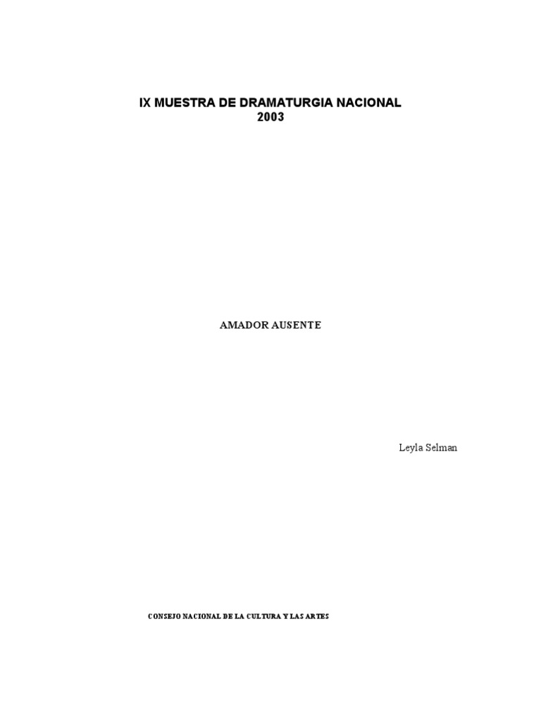 AMADOR AUSENTE fue una de las nueve obras seleccionadas en la IX Muestra de Dramaturgia Nacional, organizada por la Secretara de Comunicacin y Cultura del Ministerio Secretara General de Gobierno y el Consejo Nacional de la Cultura y las Artes. Se present, a travs de una sntesis escnica, en noviembre de 2003, en el Teatro Antonio Varas de Santiago. El Consejo Nacional de la Cultura y las Artes cuenta con la aceptacin de la autora para la publicacin de esta obra. La reproduccin comercial de esta edicin queda estrictamente prohibida. El montaje de esta pieza teatral debe ser autorizado por el dramaturgo.