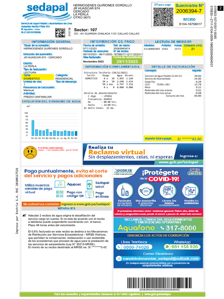 PREDIO UNIFAMILIAR C digo : LPE016 Consumo del mes 83.80