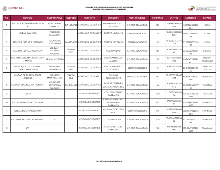 NO REFUGIO RESPONSABLE TELEFONO MUNICIPIO DIRECCION USO_INMUEBLE PERSONAS LATITUD LONGITUD ESTADO