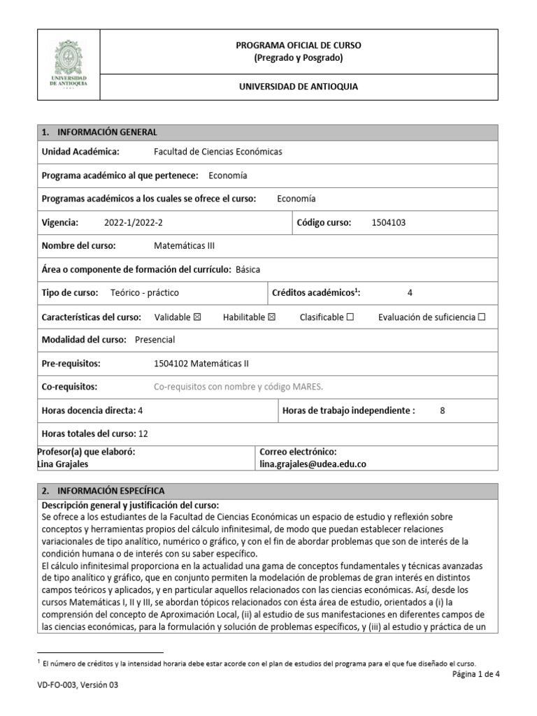 Pre-requisitos: 1504102 Matemáticas II