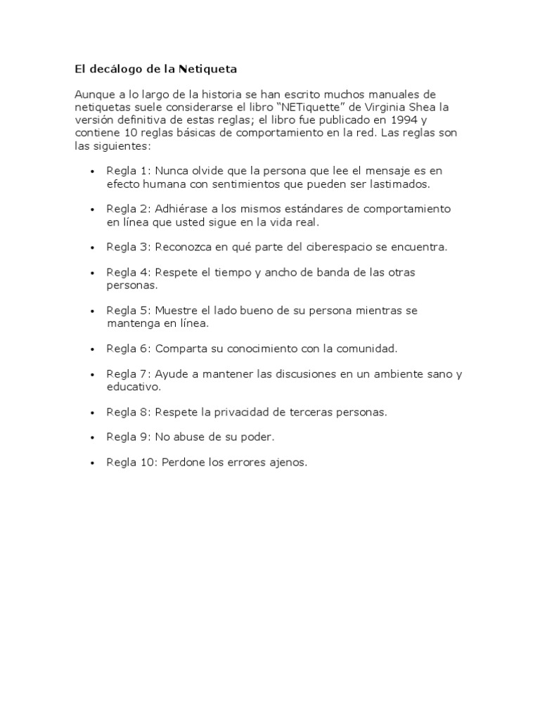 contiene 10 reglas bsicas de comportamiento en la red. Las reglas son