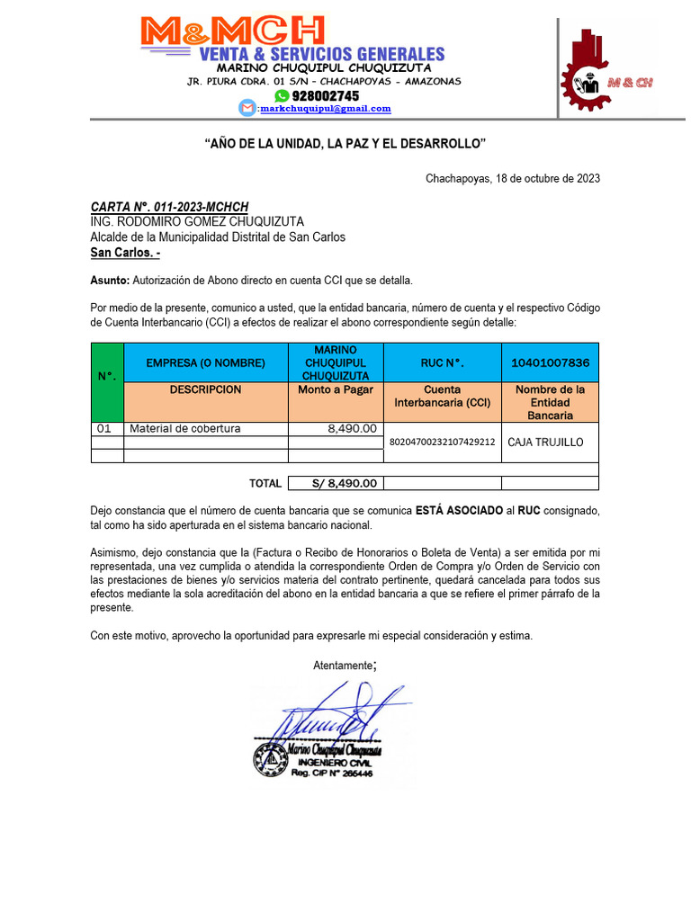 CARTA N°. 011-2023-MCHCH