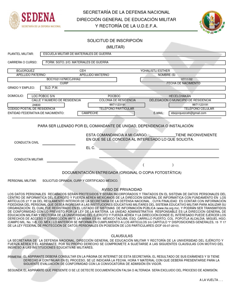 LA ADMISIÓN A LAS INSTITUCIONES EDUCATIVAS MILITARES, POR LO QUE LA FIRMA AL CALCE AVALE ESTA SITUACIÓN, Y EN CASO DE
