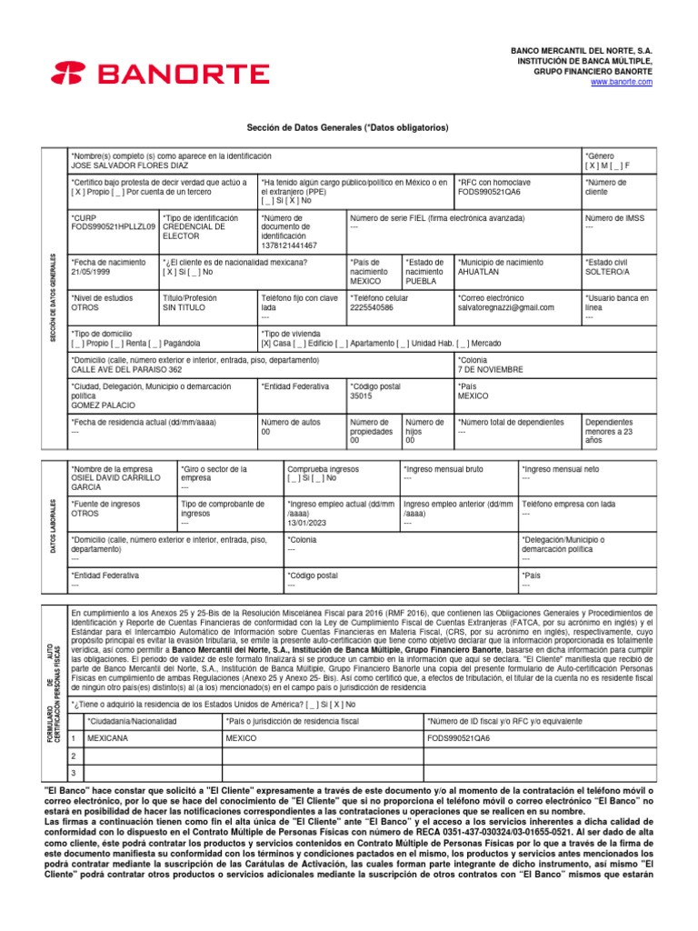 parte de Banco Mercantil del Norte, S.A., Institución de Banca Múltiple, Grupo Financiero Banorte una copia del presente formulario de Auto-certificación Personas