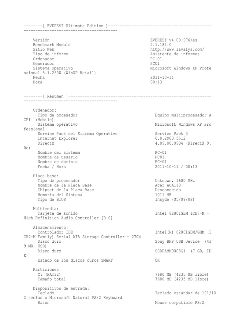 --------[ Resumen ]---------------------------------------------------------------------------------------------------Ordenador: Tipo de ordenador CPI (Mobile) Sistema operativo fessional Service Pack del Sistema Operativo Internet Explorer DirectX 0c) Nombre del sistema Nombre de usuario Nombre de dominio Fecha / Hora Placa base: Tipo de procesador Nombre de la Placa Base Chipset de la Placa Base Memoria del Sistema Tipo de BIOS Multimedia: Tarjeta de sonido High Definition Audio Controller [B-0] Almacenamiento: Controlador IDE CH7-M Family) Serial ATA Storage Controller - 27C4 Disco duro 9 MB, USB) Disco duro E) Estado de los discos duros SMART Particiones: C: (FAT32) Tamao total Dispositivos de entrada: Teclado 2 teclas o Microsoft Natural PS/2 Keyboard Ratn Equipo multiprocesador A Microsoft Windows XP Pro Service Pack 3 6.0.2900.5512 4.09.00.0904 (DirectX 9. PC-01 PC01 PC-01 2011-10-11 / 00:13 Unknown, 1600 MHz Acer AOA110 Desconocido 1011 MB Insyde (05/09/08) Intel 82801GBM ICH7-M -