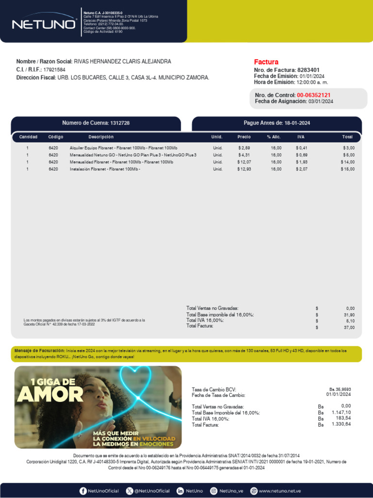 1 6420 Mensualidad Netuno GO - NetUno GO Plan Plus 3 - NetUnoGO Plus 3 Unid. $ 4,31 16,00 $ 0,69 $ 5,00