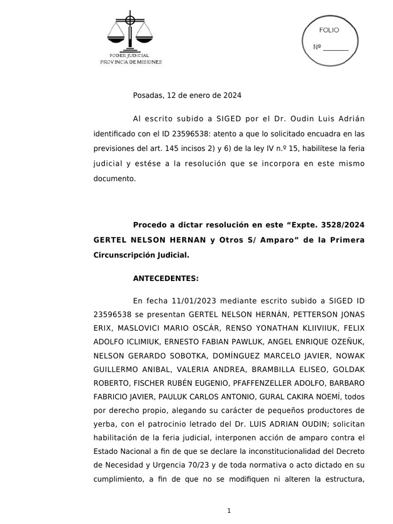 yerba, con el patrocinio letrado del Dr. LUIS ADRIAN OUDIN; solicitan